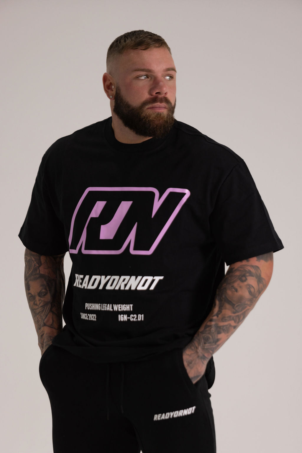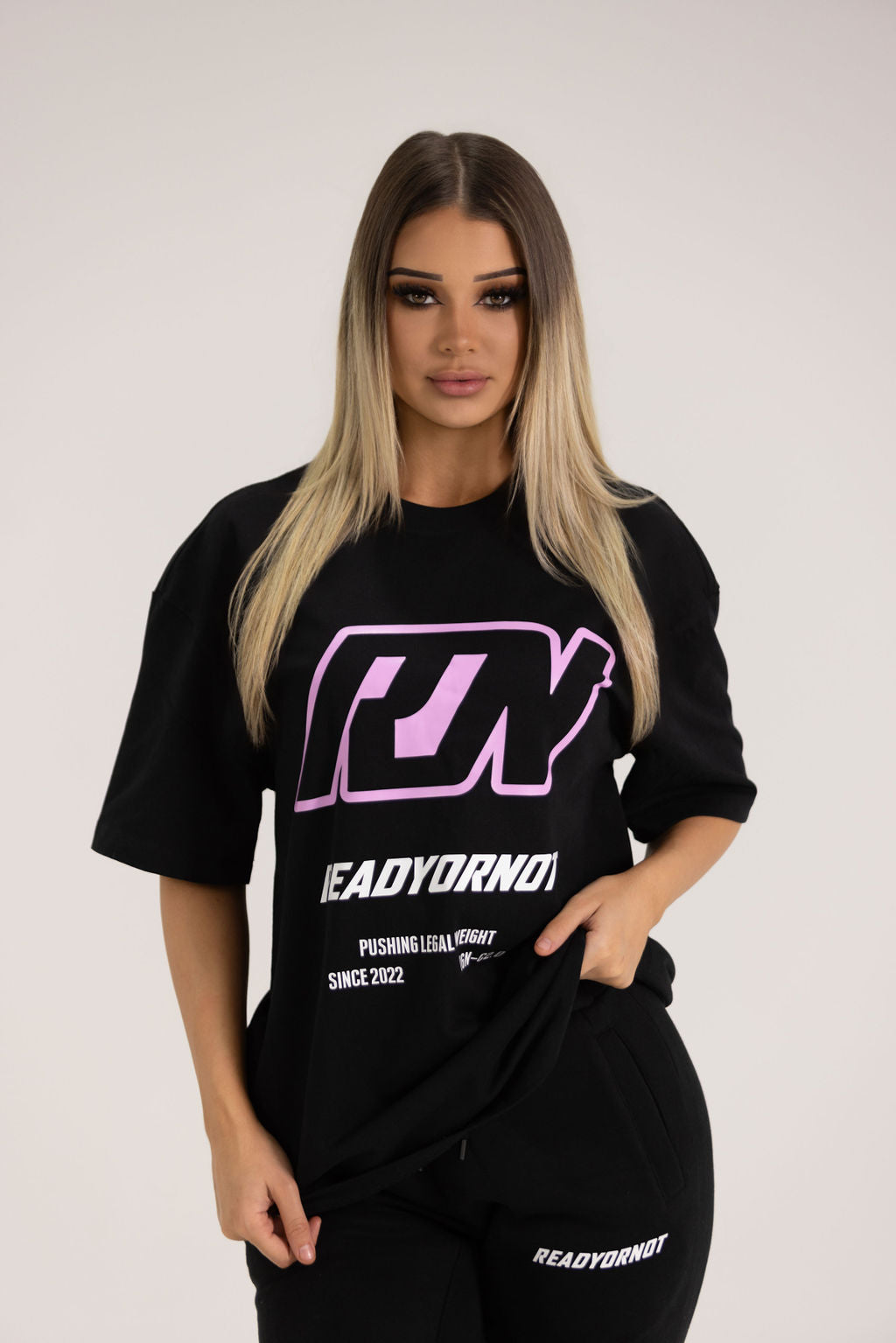 Indulge in unparalleled comfort with our Oversized T-shirt, meticulously crafted from premium, lightweight fabric. It's a sensation against your skin, ensuring a dreamlike experience wherever you go. The oversized fit provides maximum freedom of movement, empowering you to conquer city streets effortlessly or dominate your workout without constraint. Embrace the comfort and versatility of this tee as you navigate through life's adventures. With its bold "Ready or Not" graphic on the front, it's not just a garment—it's your statement piece for the streets and the gym, making every moment count.